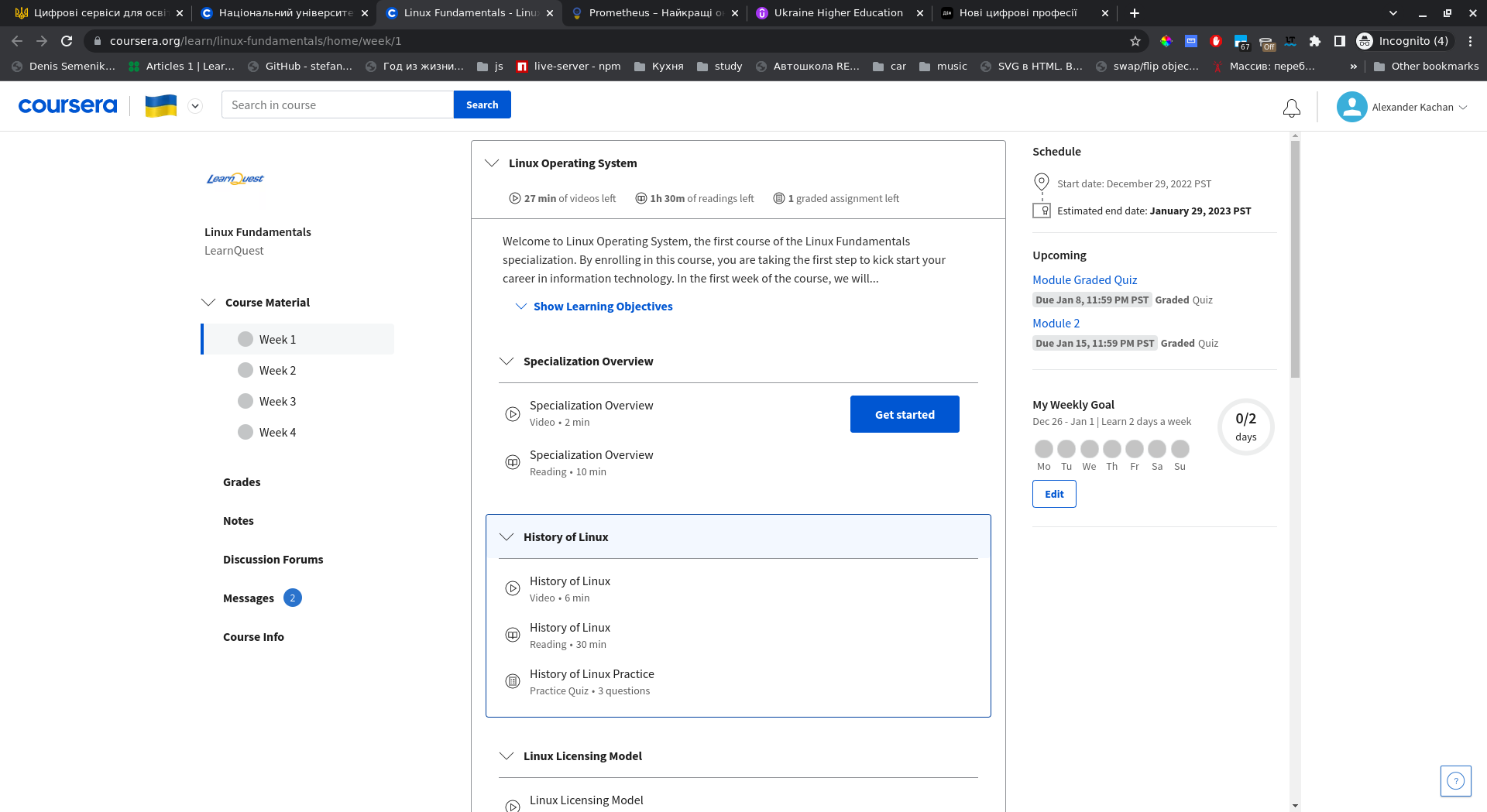 На сайті COURSERA, ознайомившись з переліком онлайн-курсів, зареєструвався на один з них і почав проходити, а саме - "Learning Linux for LFCA Certification Specialization"